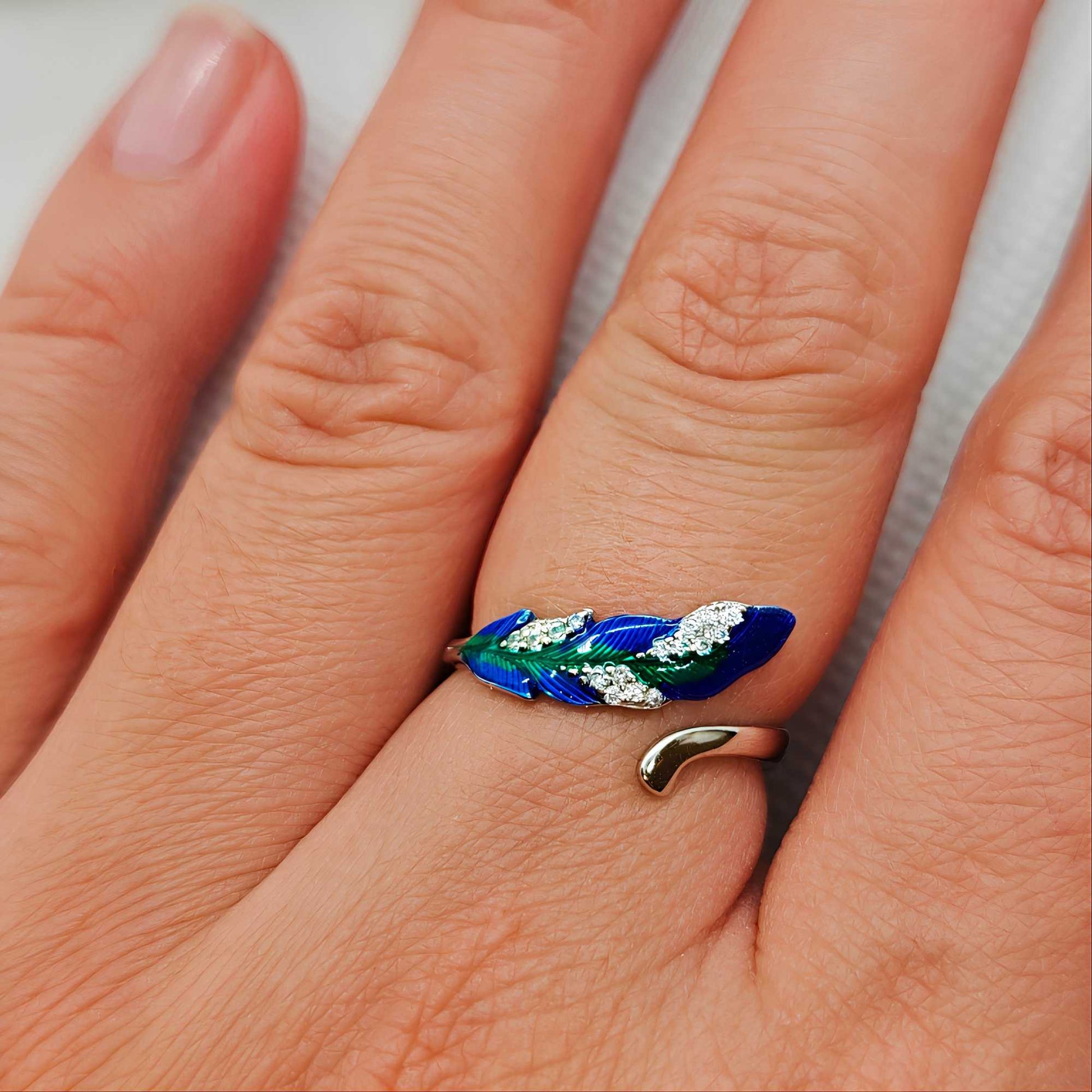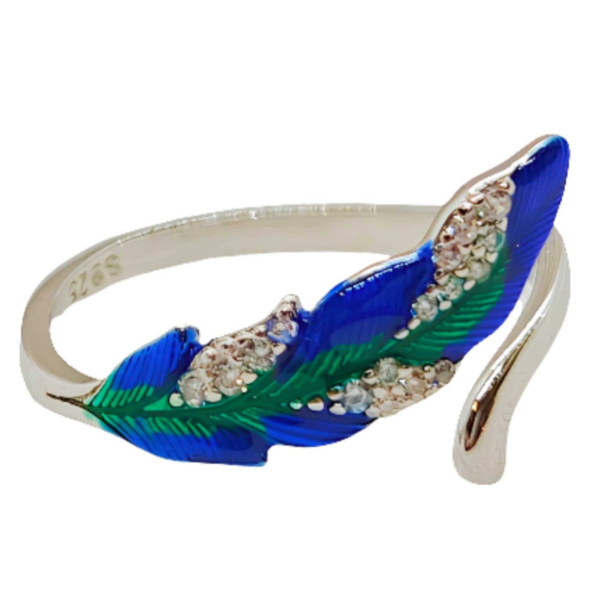 Su forma de pluma delicadamente detallada está embellecida con circones transparentes, que aportan un brillo sutil y elegante. Además, el lacado en tonos azul y verde simula el efecto iridiscente de las plumas de pavo real, creando una pieza vibrante y llena de significado.