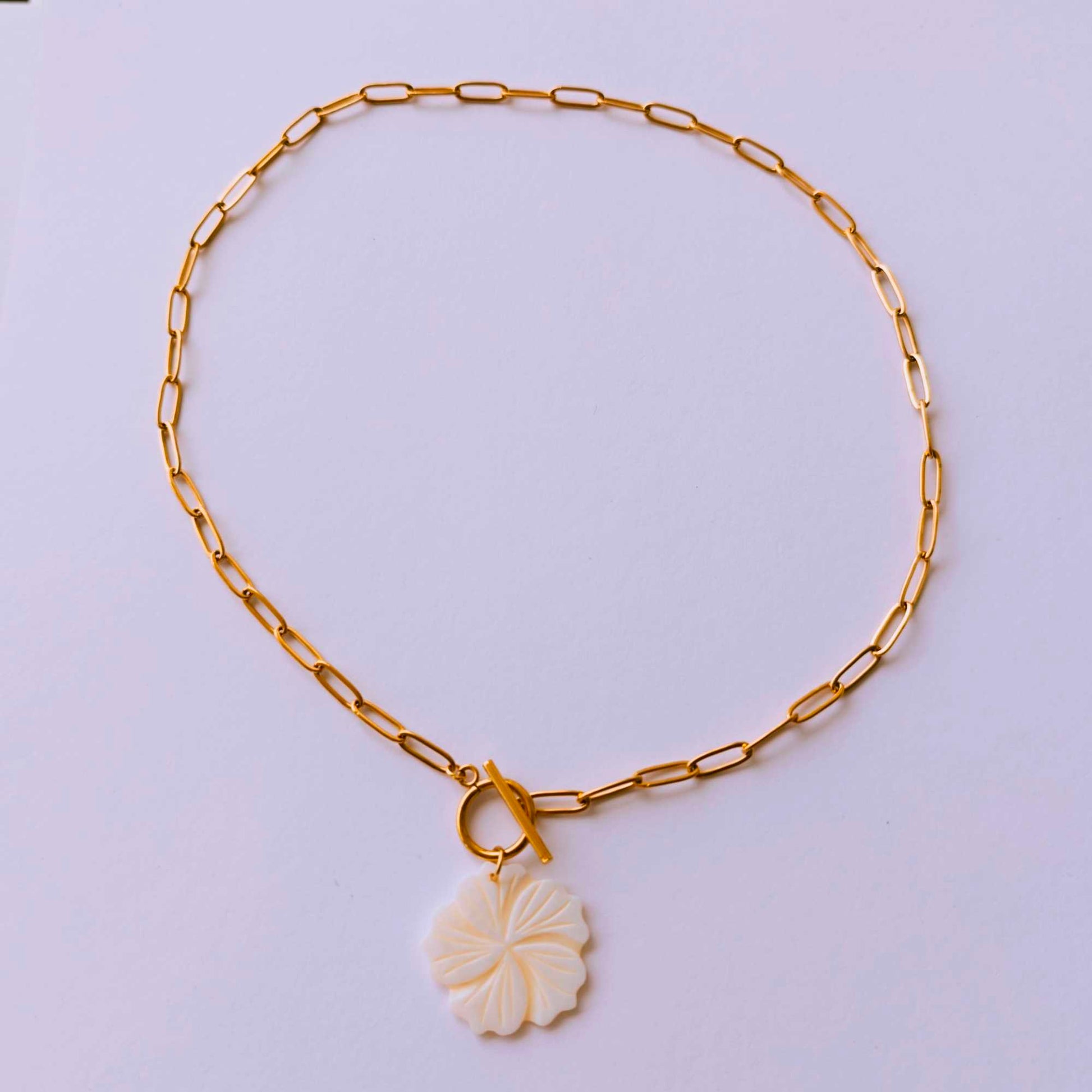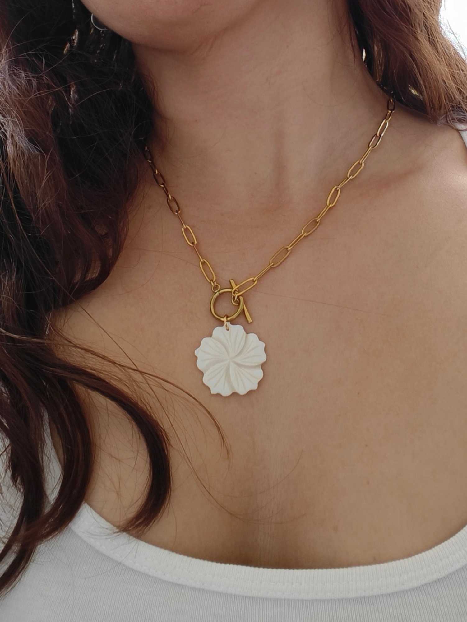 Añade un toque de elegancia natural a tu look 😍. Su colgante en forma de flor blanca, elaborado en nácar, destaca por su brillo sutil y su acabado suave, perfecto para realzar cualquier outfit, desde el más casual hasta el más especial.