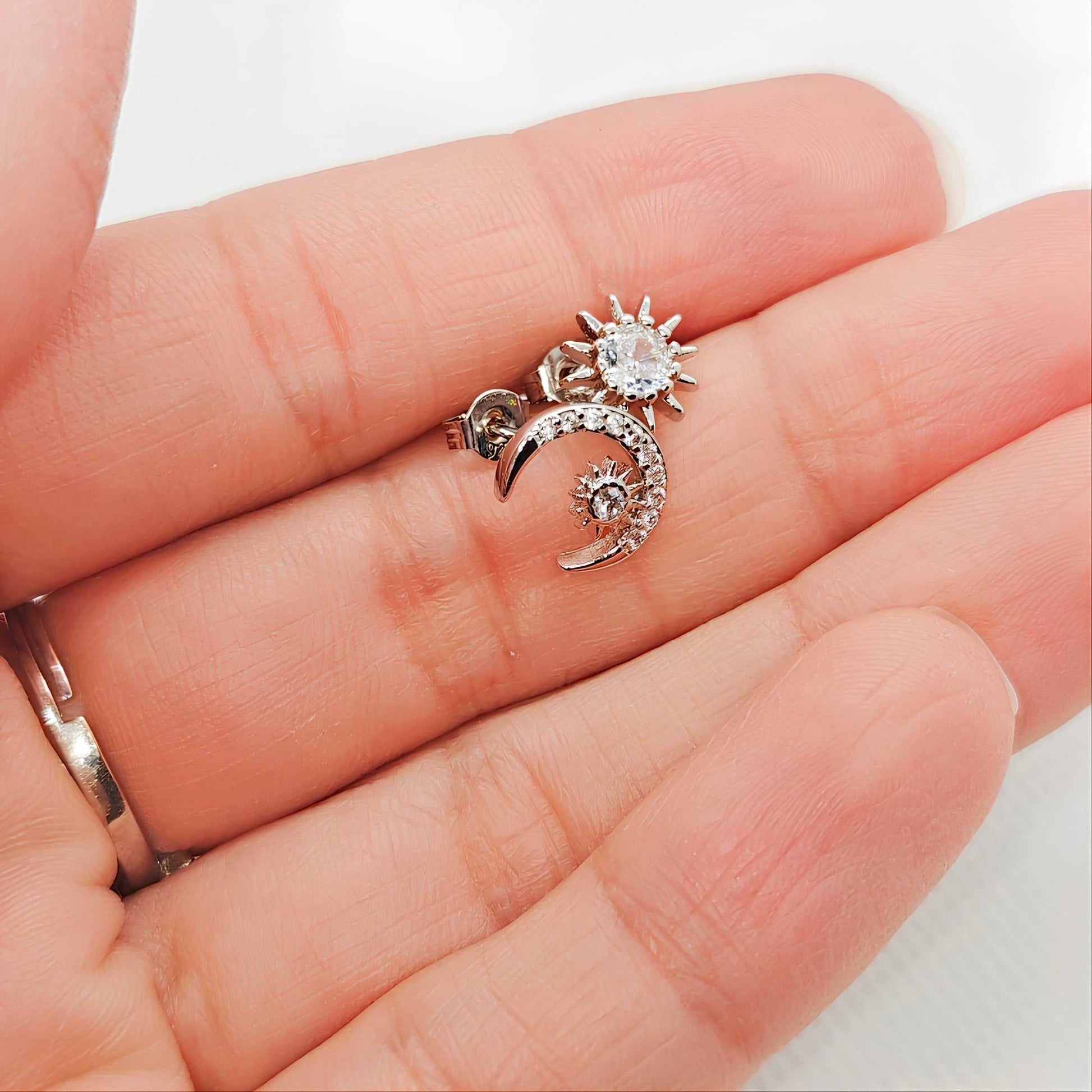 Descubre la elegancia de nuestros pendientes asimétricos de plata, diseñados para destacar en cualquier ocasión. Un pendiente presenta una encantadora media luna adornada con una estrella, mientras que el otro exhibe un sol resplandeciente con un cristal transparente central. Ambos pendientes están realzados con cristales brillantes decorativos que aportan un toque de luminosidad. Con su estilo tipo botón, son perfectos para quienes buscan una joya única y moderna.