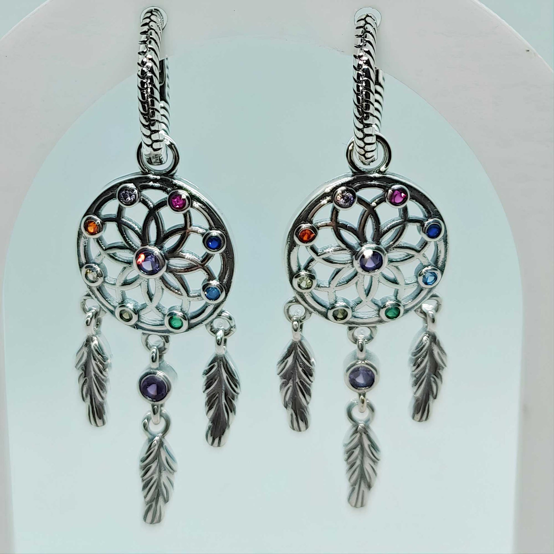 Cada pendiente presenta un delicado aro de plata, del cual cuelga un encantador atrapasueños adornado con vibrantes cristales de colores y hojas de plata.