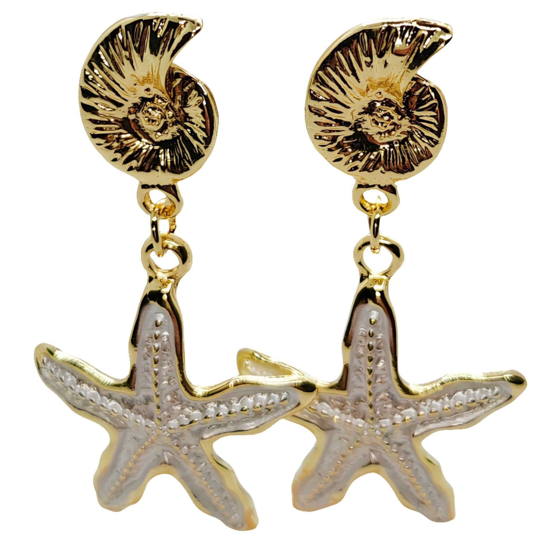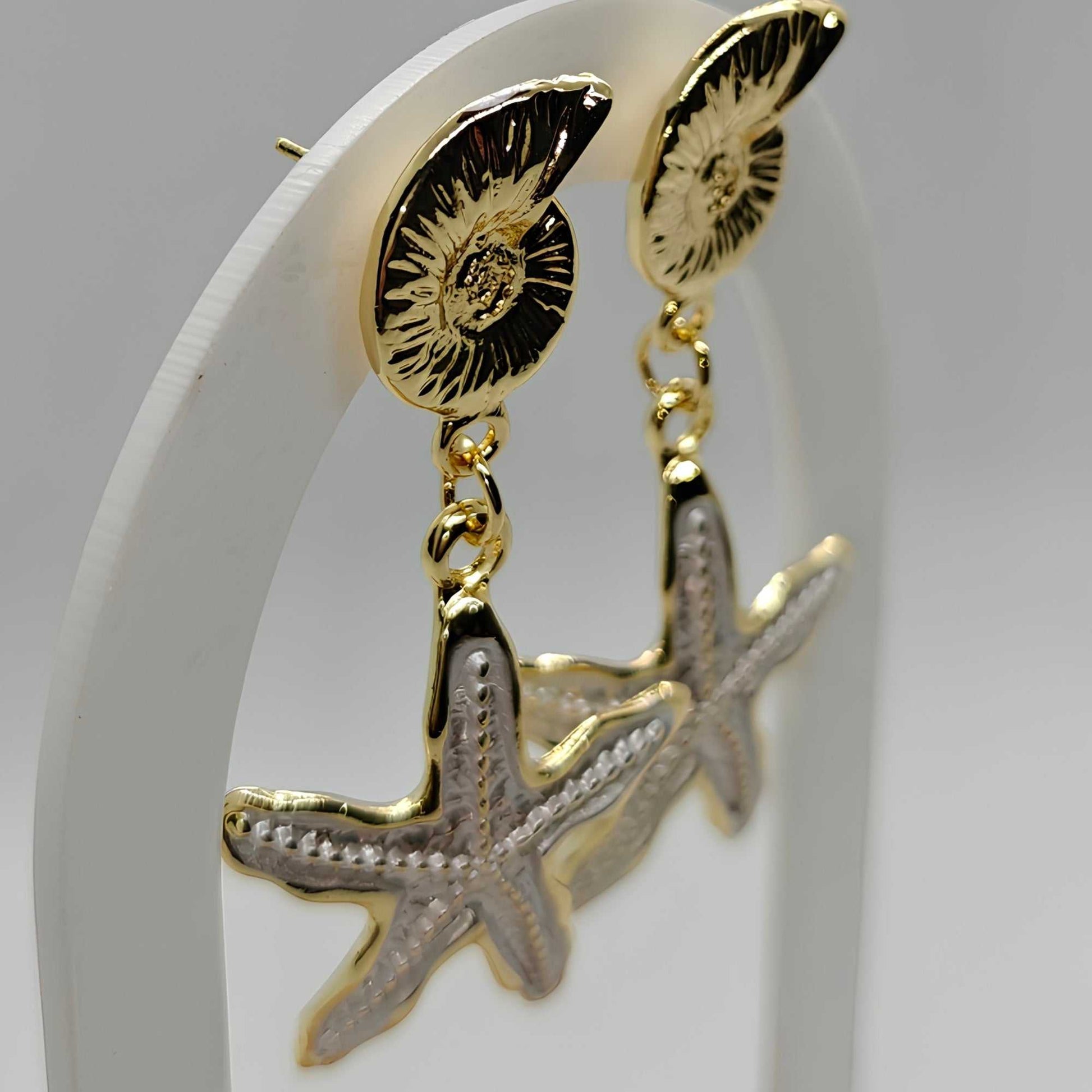 Añade un toque de elegancia marina a tu colección con estos encantadores pendientes colgantes. Diseñados con un cierre de botón para mayor comodidad, presentan un delicado caracol y una brillante estrella de mar, ambos elaborados en hermosos tonos dorados. Perfectos para cualquier ocasión, estos pendientes son ideales para quienes buscan un accesorio que combine estilo y originalidad.