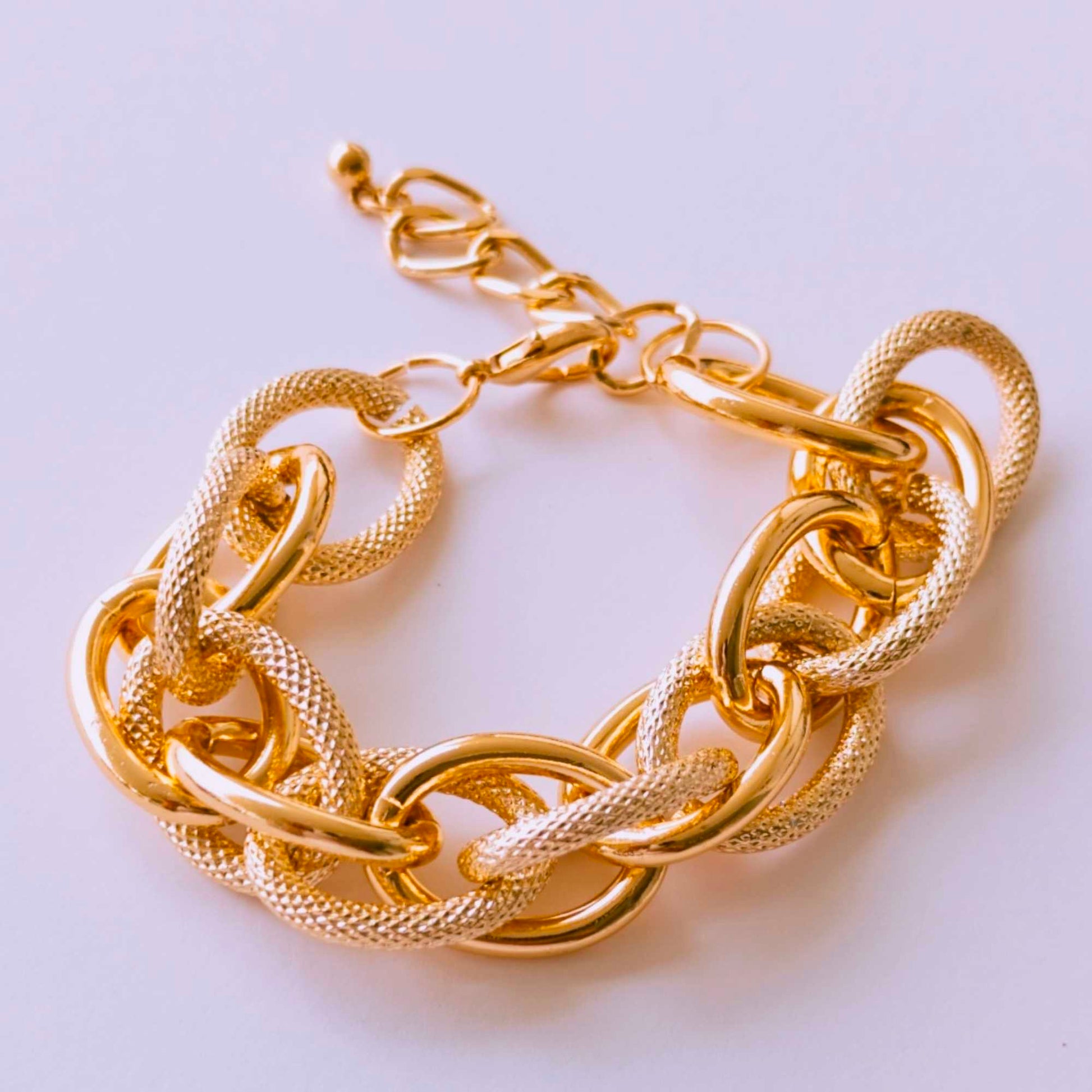 Añade un toque de elegancia a tu look con la pulsera Tina, un accesorio versátil y sofisticado. Diseñada con eslabones grandes entrelazados en un precioso tono dorado, esta pulsera se adapta fácilmente a cualquier muñeca gracias a su diseño ajustable.