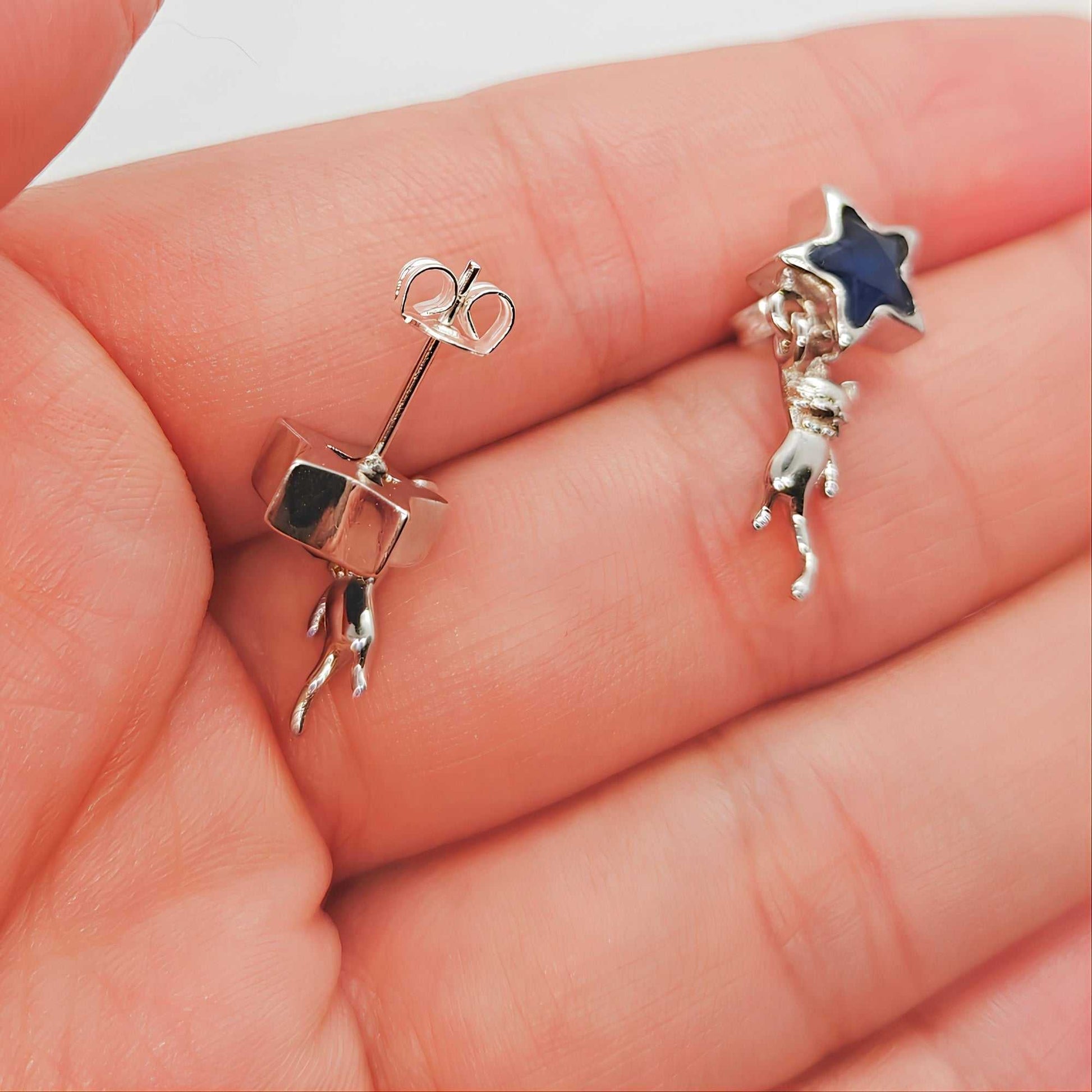 Descubre estos encantadores pendientes en plata tipo botón, perfectos para añadir un toque de elegancia a cualquier look. Cada pendiente presenta un hermoso diseño en forma de estrella, adornado con un cristal en un profundo azul marino que captura la luz de manera fascinante. Colgando de la estrella, un delicado gato en plata agrega un toque juguetón y único. Ideales para los amantes de los animales y la joyería sofisticada, estos pendientes son una opción perfecta para el día a día o ocasiones especiales.