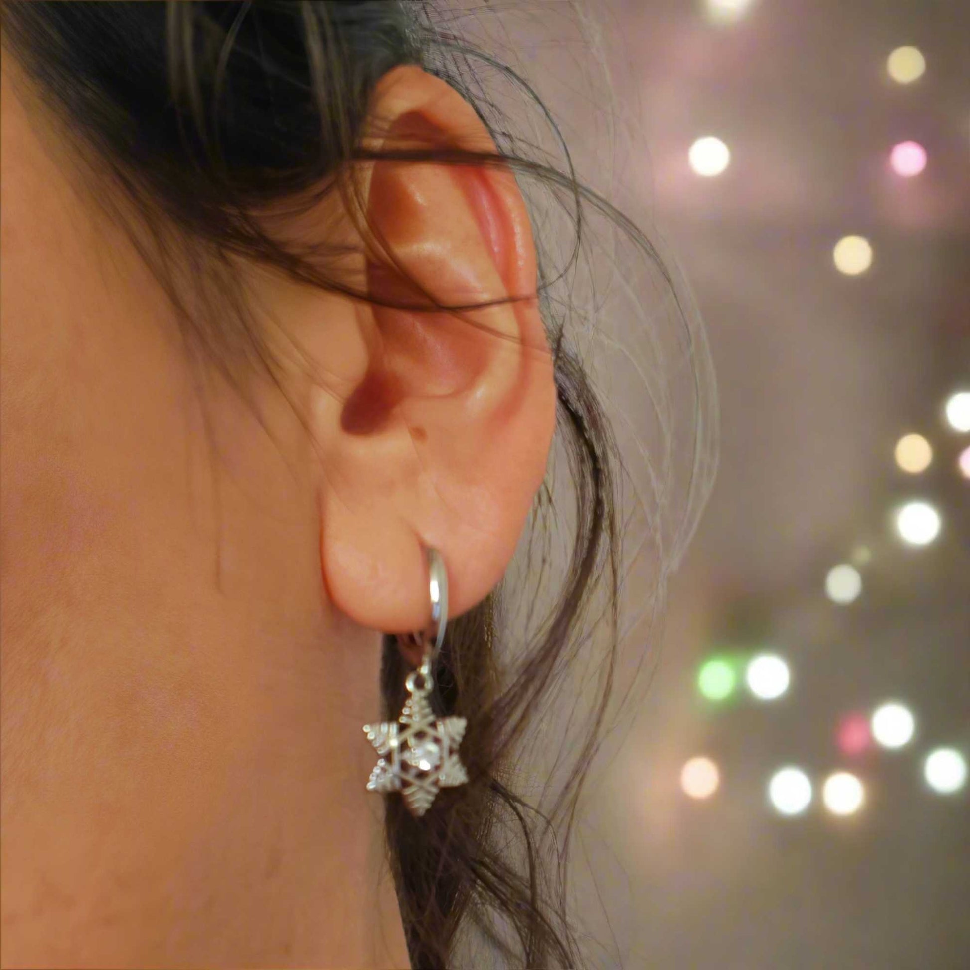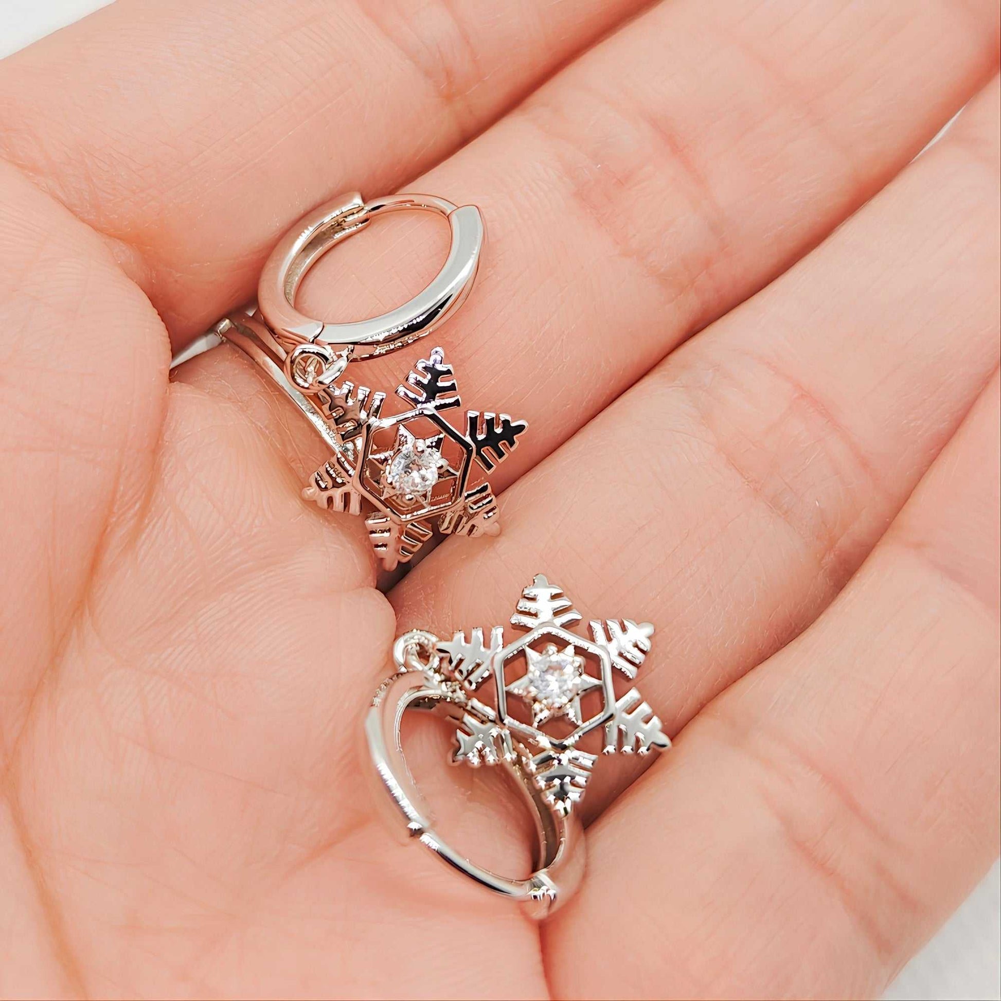Añade un toque de magia invernal a tu look con estos elegantes pendientes de plata tipo aro. Perfectos para la temporada de invierno o cualquier ocasión especial, estos pendientes cuentan con un diseño colgante de copo de nieve, elaborado con gran detalle para capturar la belleza única de los cristales de hielo.